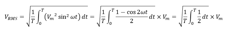 ①式にV(t)=Vmsinωtを代入すれば,正弦波交流電圧の実効値を計算できます.