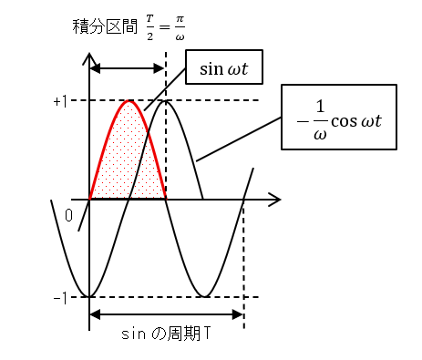 ここで,sinωtの積分は-(1/ω) cosωt,積分区間はT/2=π/ωなので,