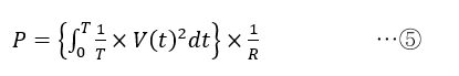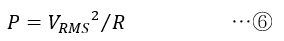 各瞬間の電力P(t)はP(t)=I(t)×V(t)ですが,これは④式のようにV(t)2に比例し,平均電力はVRMSの2乗から求められます.あるいは,⑧式のようにI (t)2に比例し,平均電力はIRMSの2乗から求められます.さらに,P=VRMS2/RとP=IRMS2×Rをかけると,