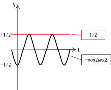 cos2ωtはsinωtの1/2の周期をもつ三角関数で,-cos2ωtはその正負を反転したものです(図2(a)).その振幅を1/2にした-cos2ωt/2を定数1/2に加えたものがsin2ωt=(1-cos2ωt)/2 となります((図2(b)).ここで,-cos2ωt/2の部分を周期Tにわたって積分すれば正と負が打ち消しあって0になるので,sin2ωt=(1-cos2ωt)/2の積分は定数1/2の部分だけを積分していることになります(図2(c)).