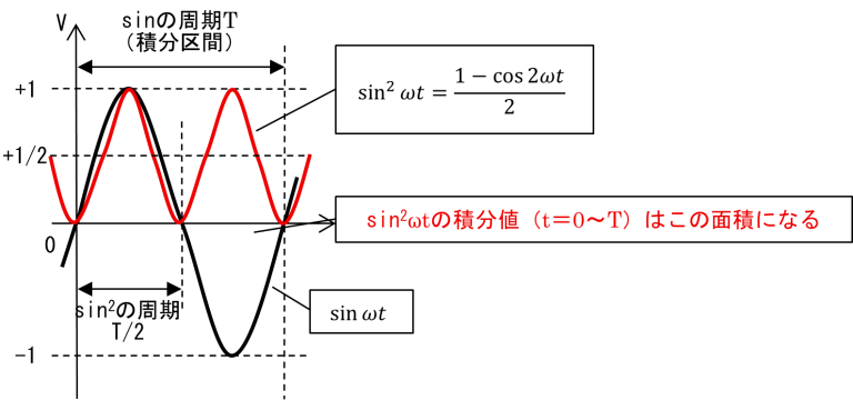 まず,実効値ではV(t)2=Vm2sin2ωtを計算する必要があります.三角関数の倍角公式を利用すれば,