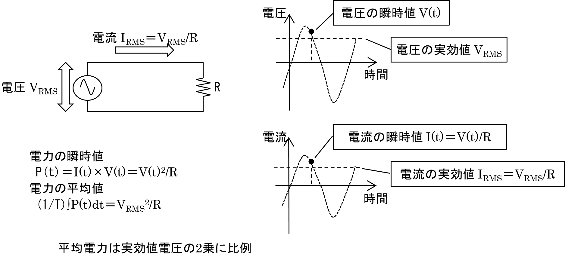 交流の電圧,電流を実効値VRMS,IRMSで表すと,直流のオームの法則V=I×R,ワットの法則P=I×V=V2/R=I2×Rなどの式は,そのまま交流に置き換えられます.